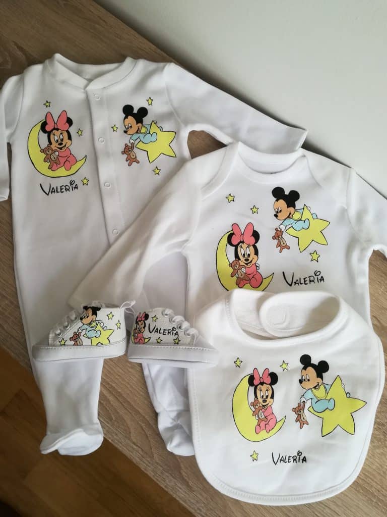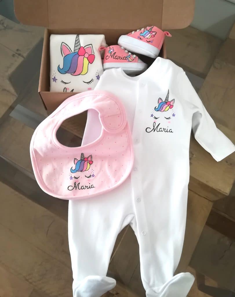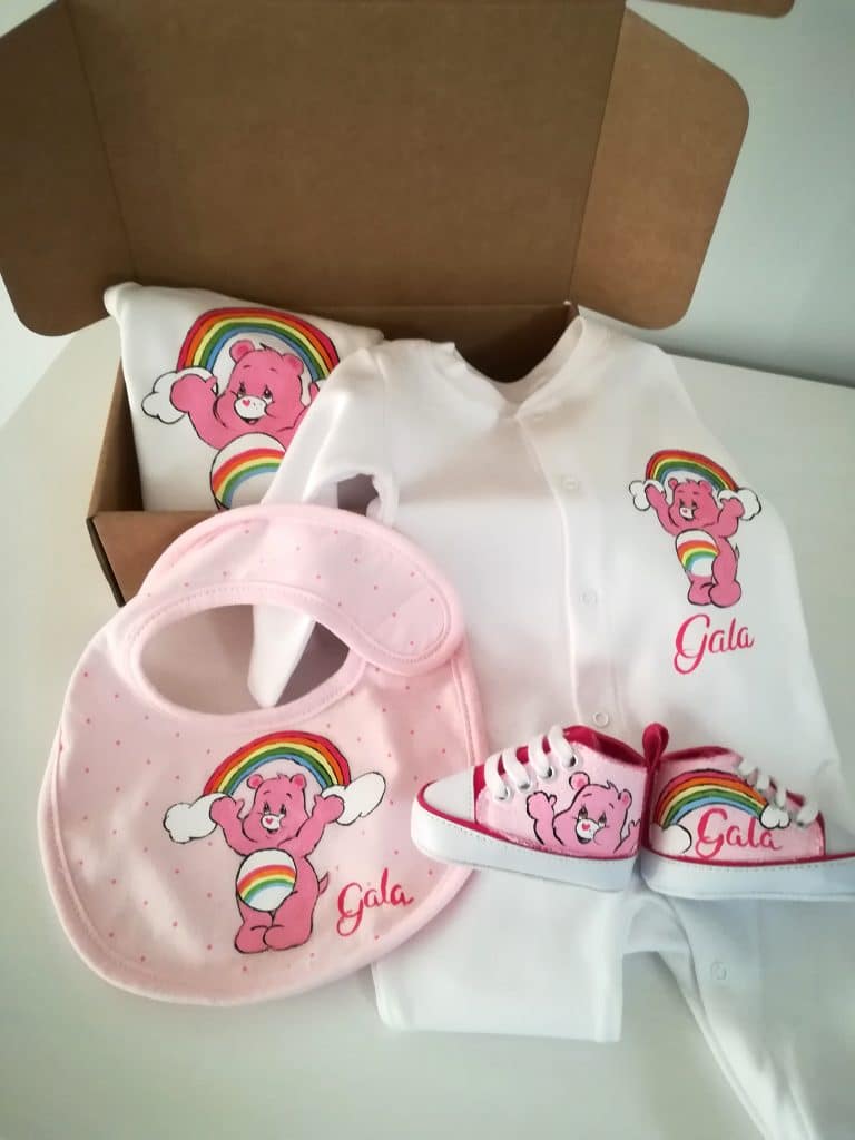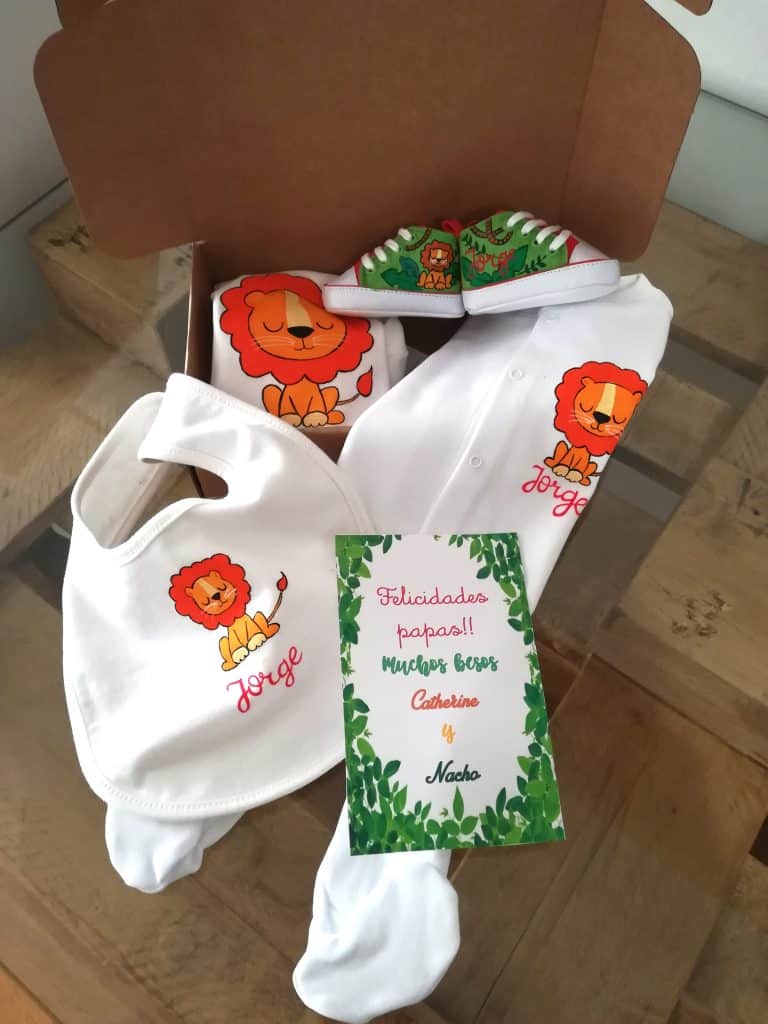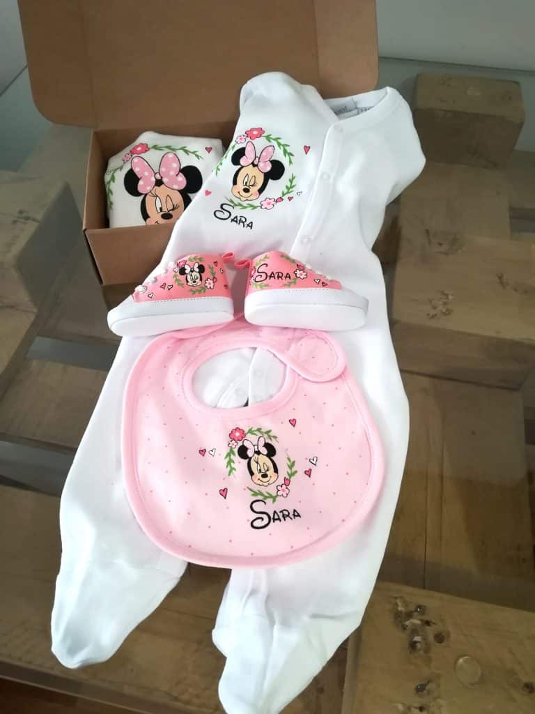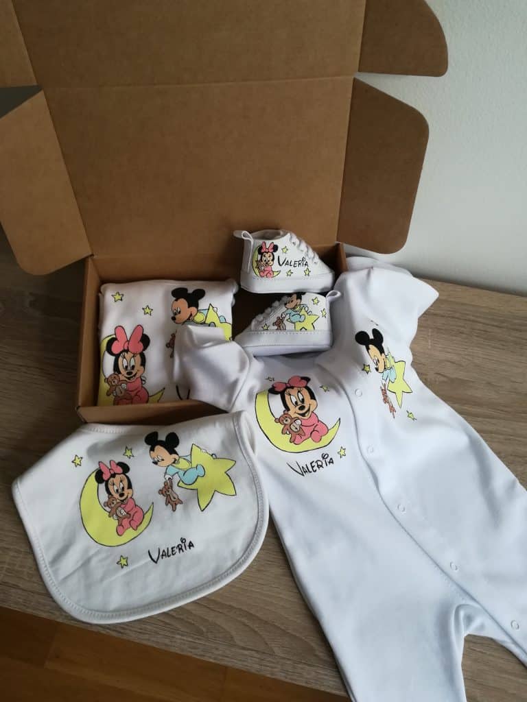 Incluye: un body (de manga larga o manga corta), un babero, un pijama y unas zapatillas