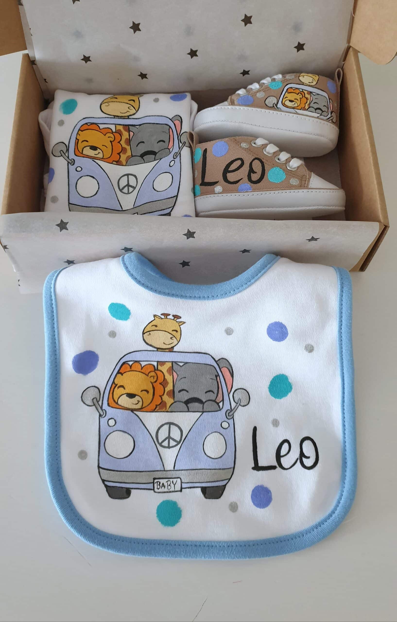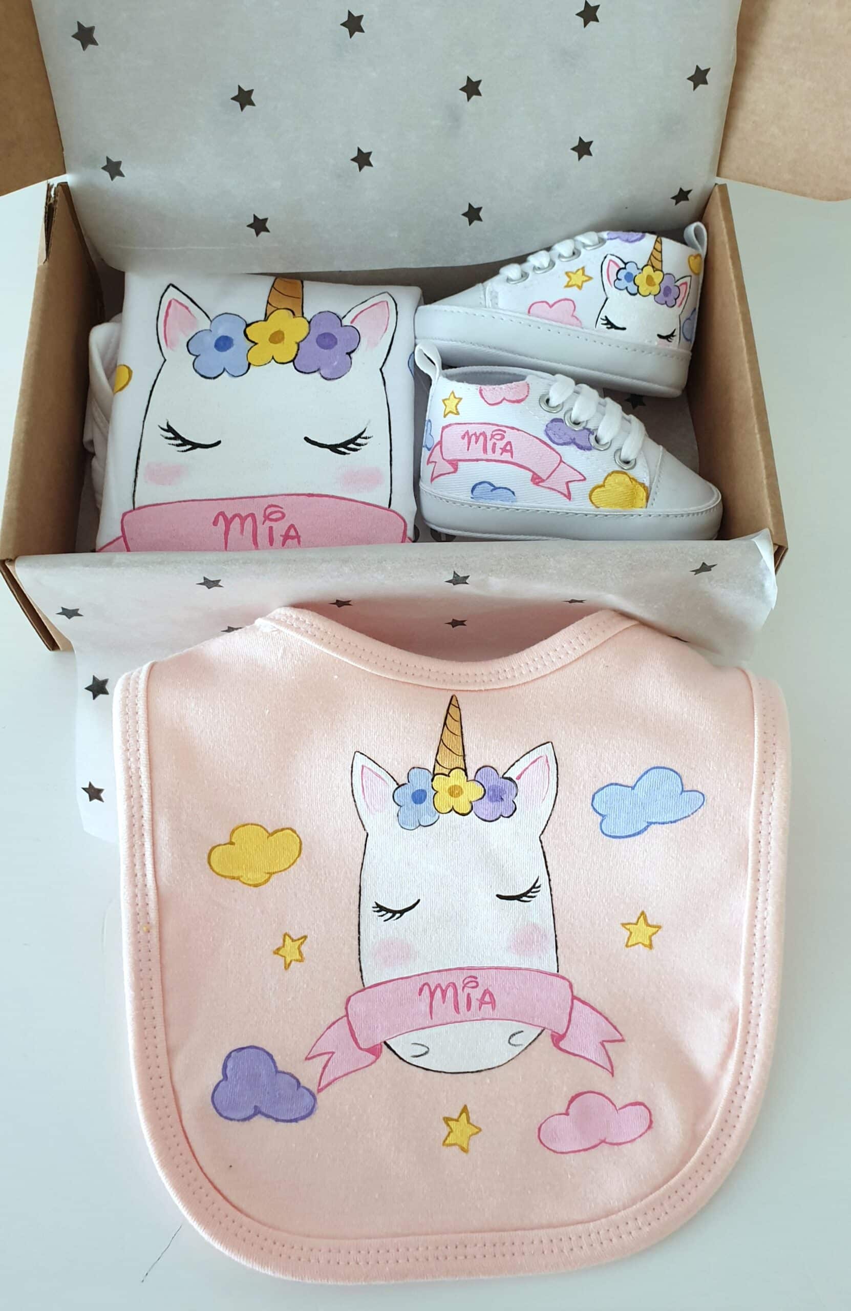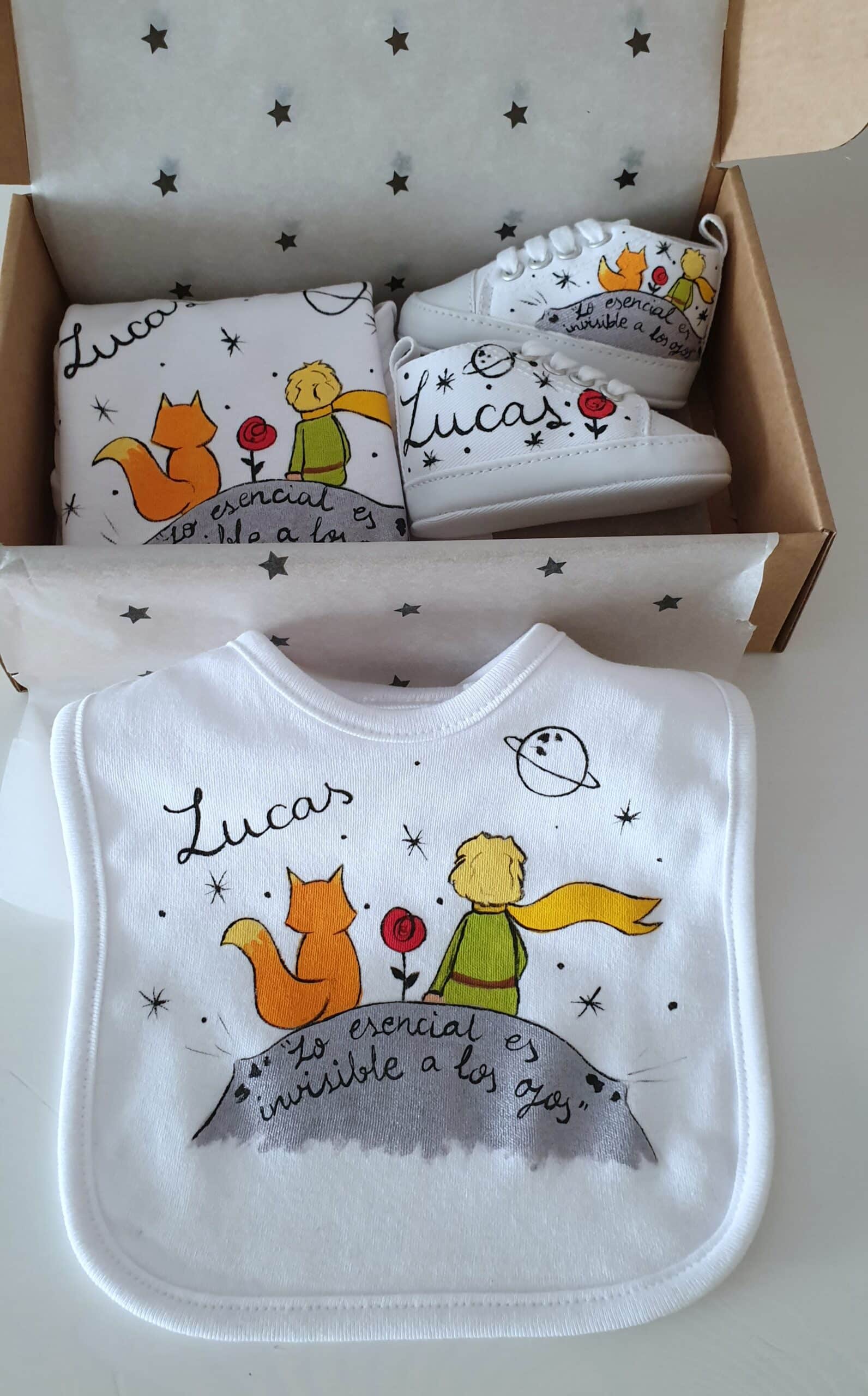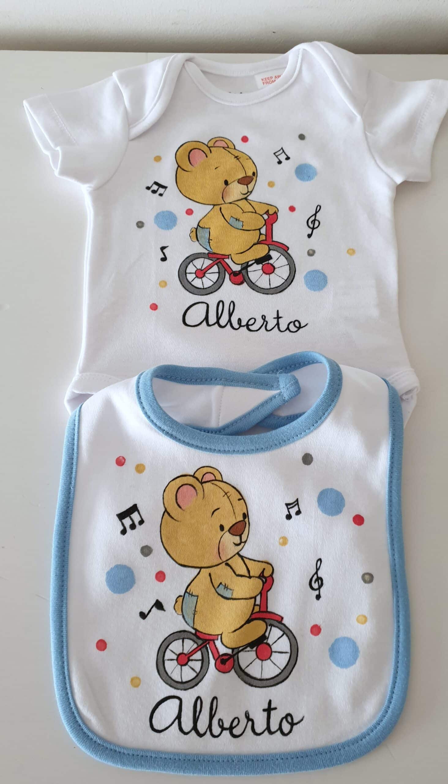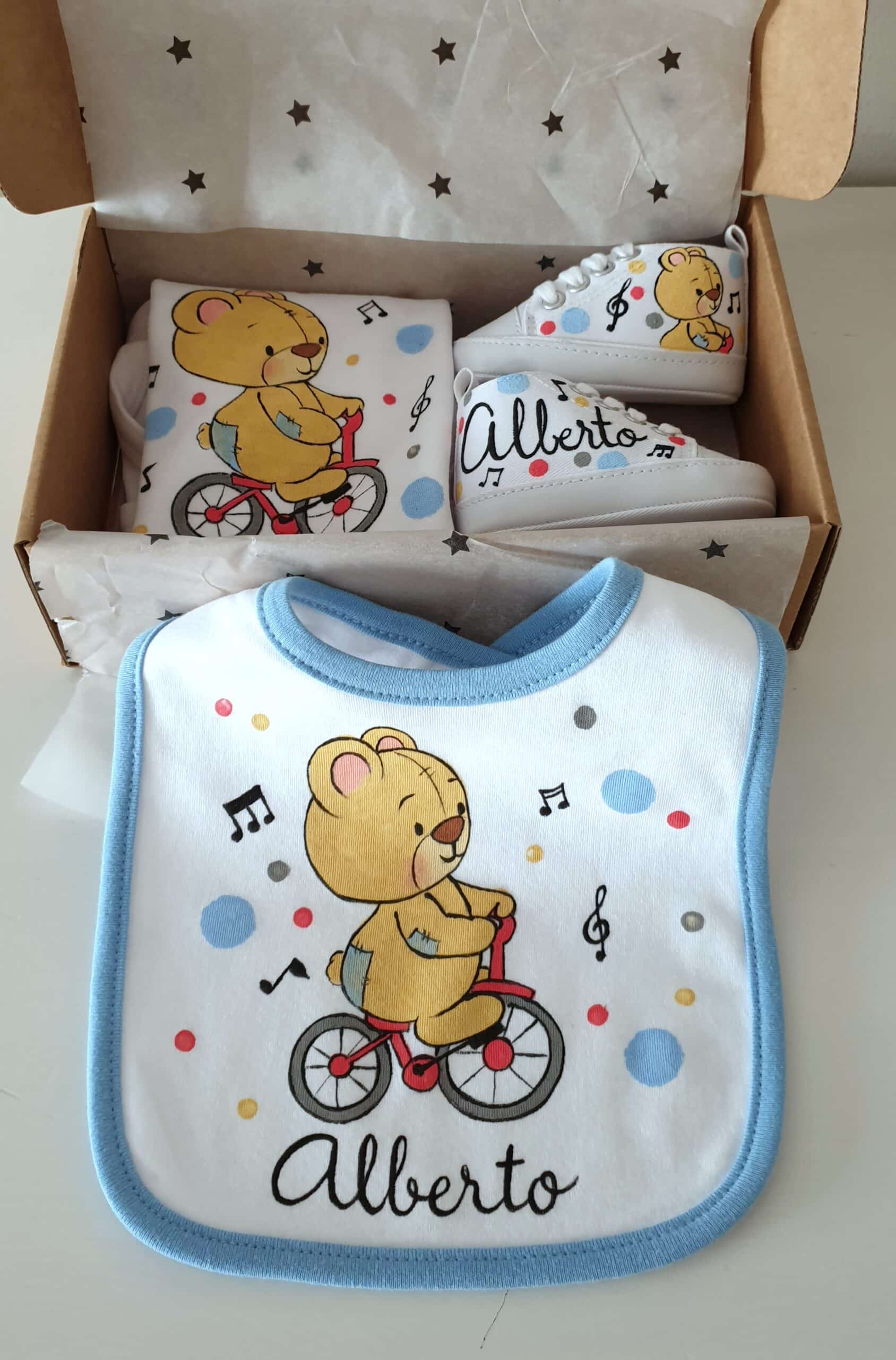 Incluye: un body (de manga larga o manga corta), un babero y zapatillas de bebé.