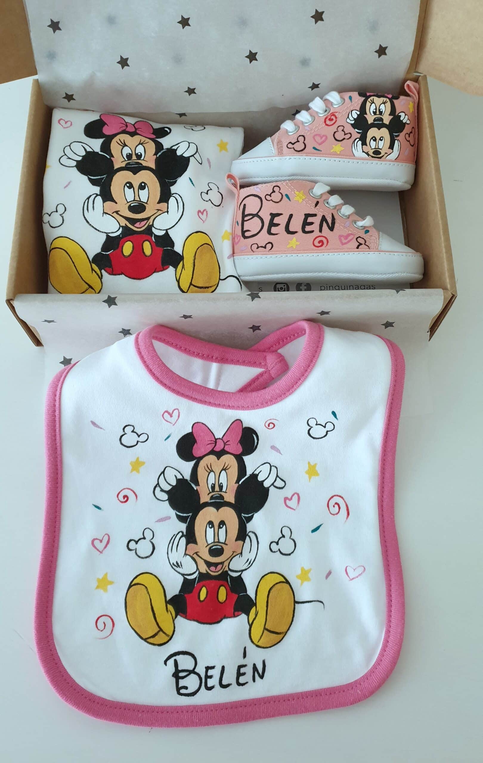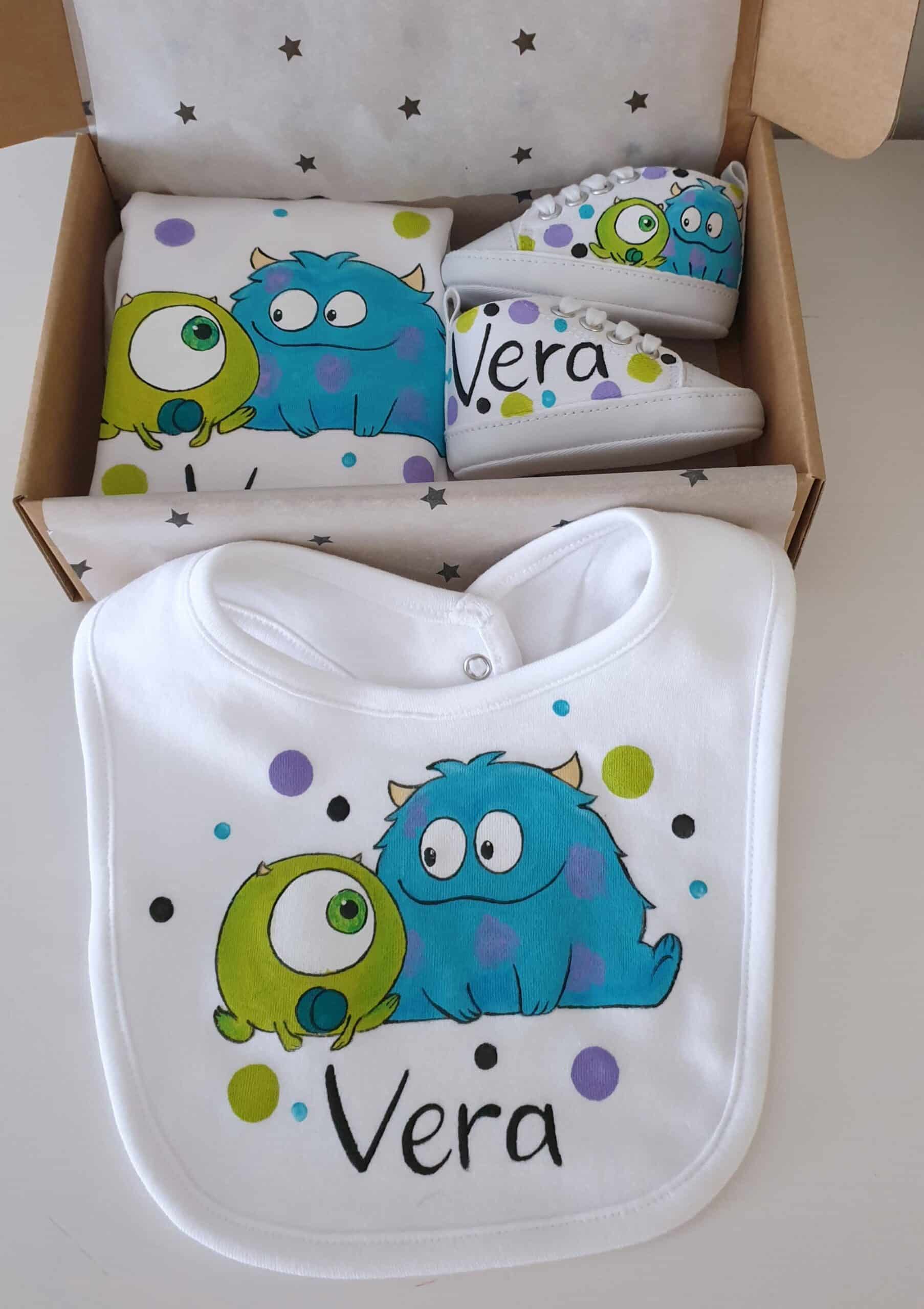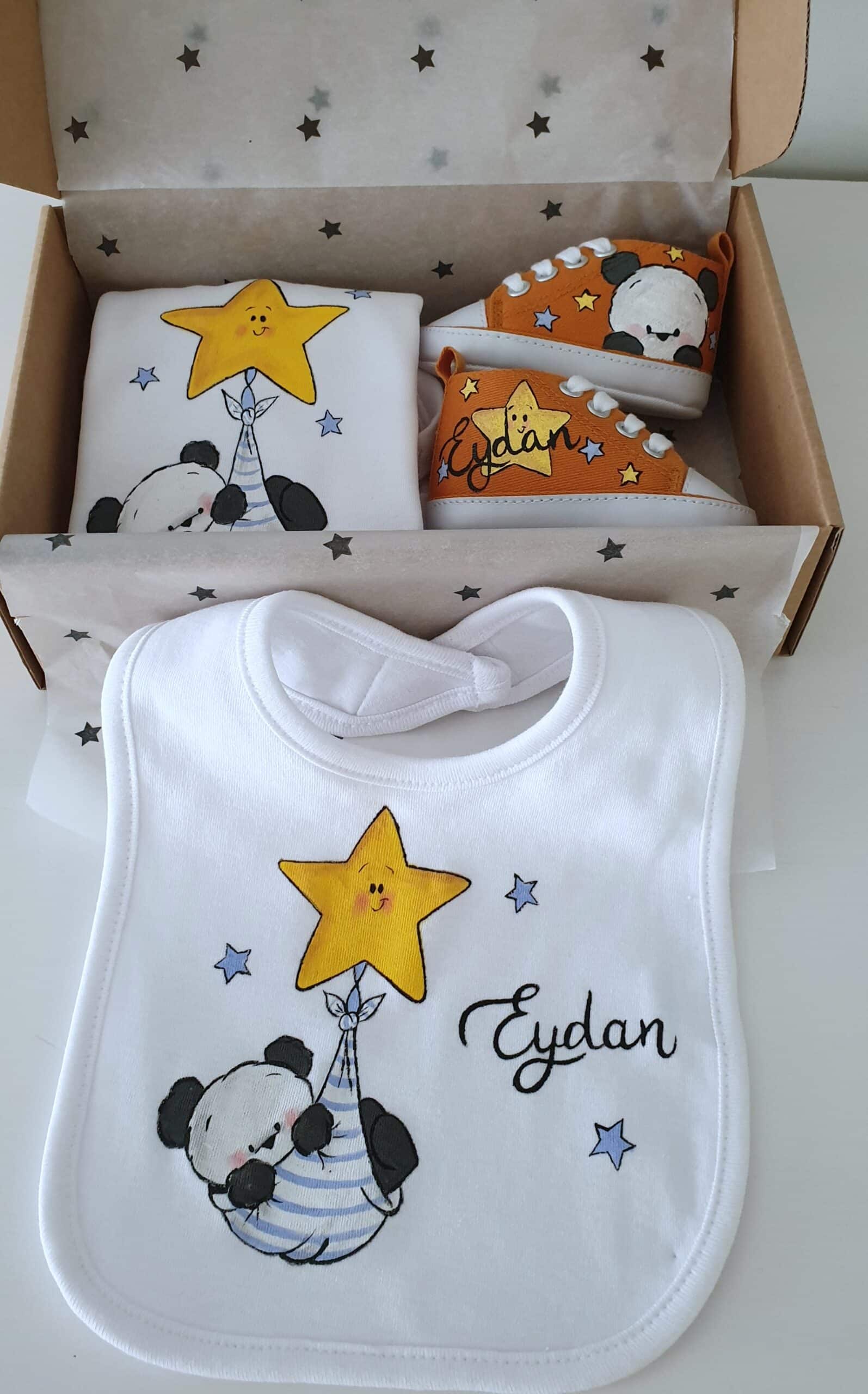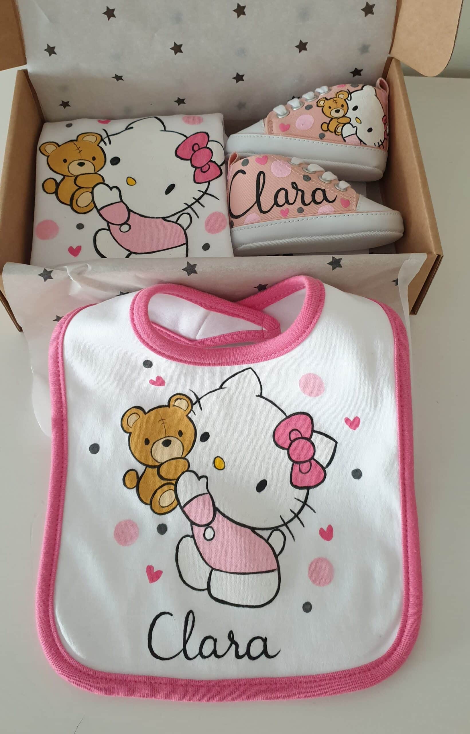 Incluye: un body (de manga larga o manga corta), un babero y zapatillas de bebé.