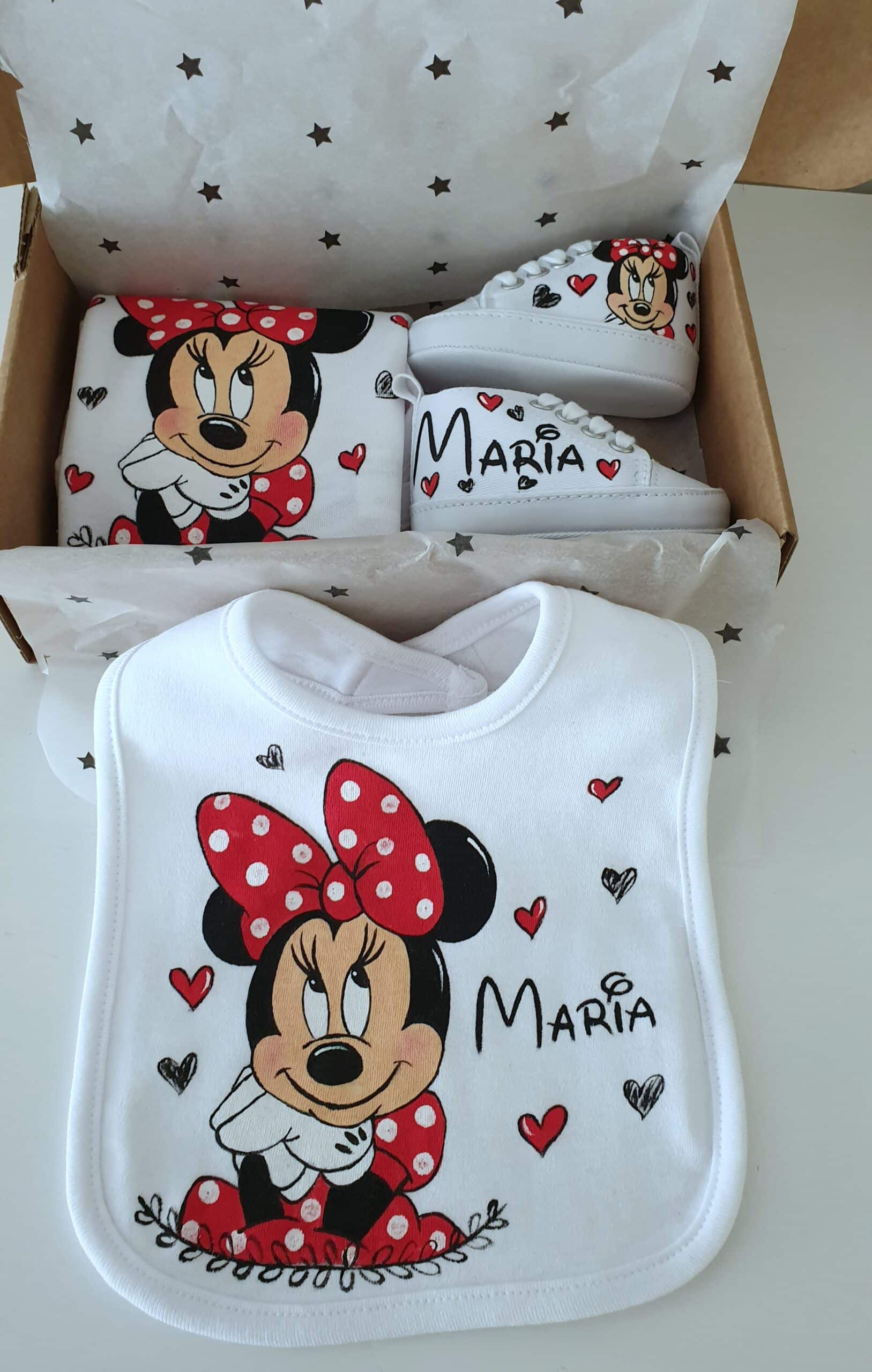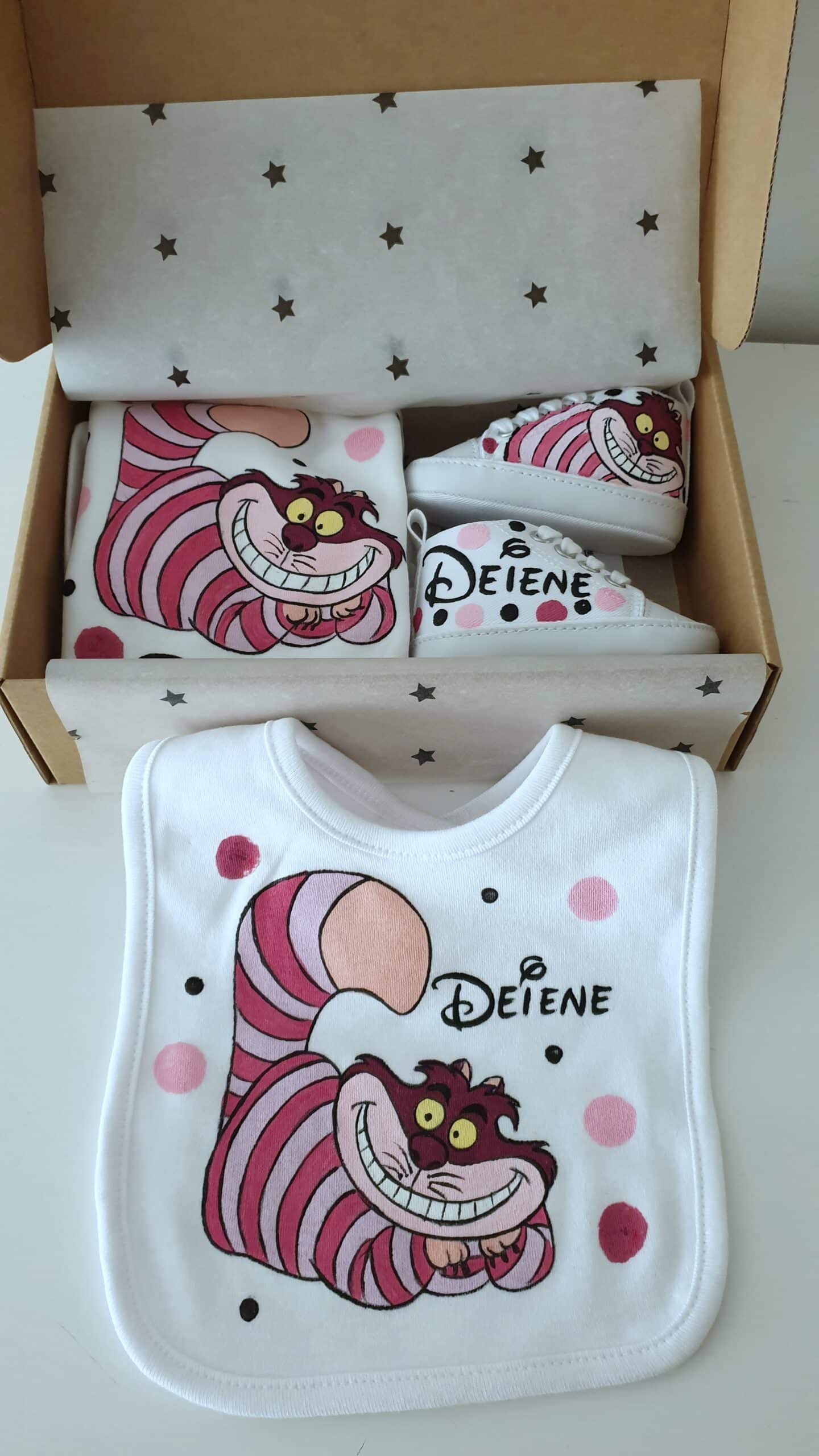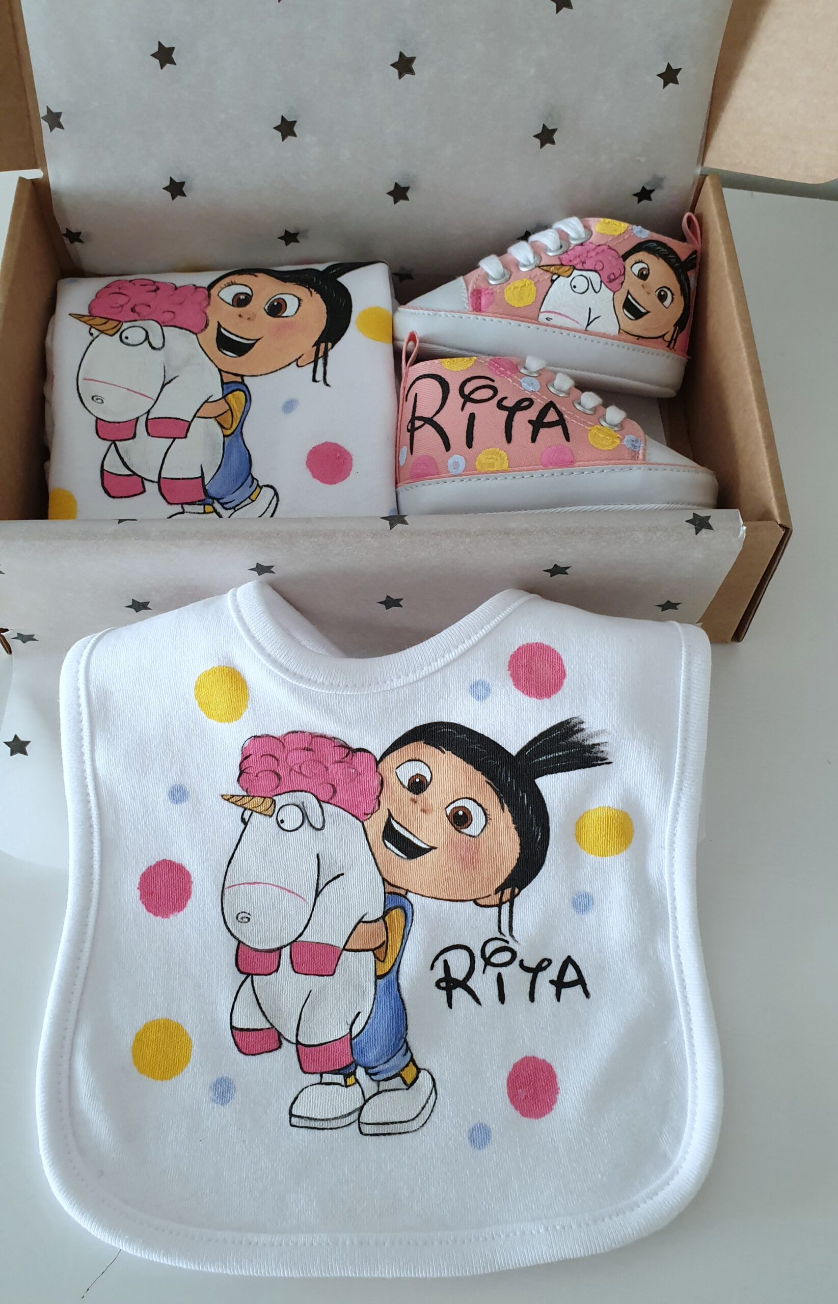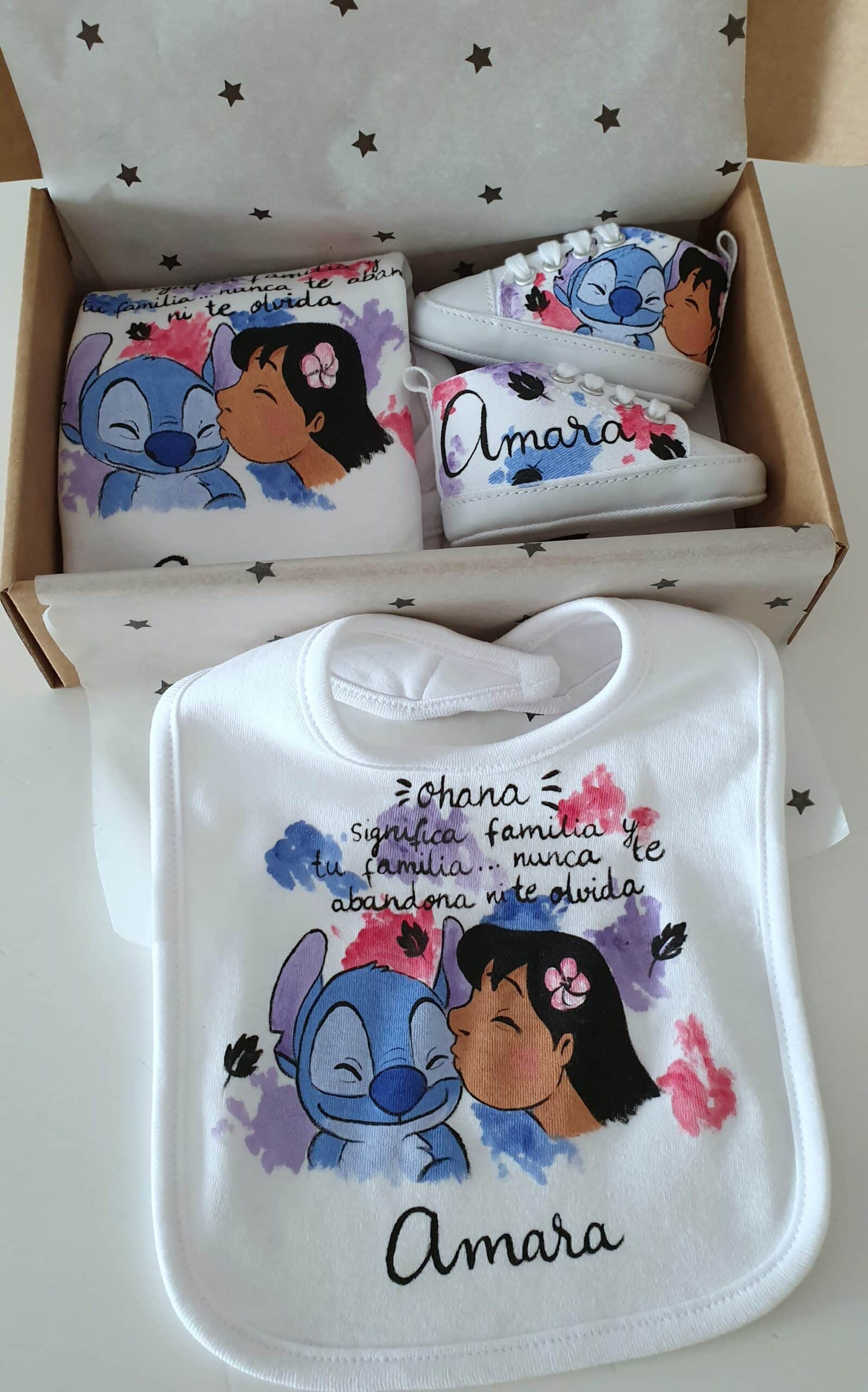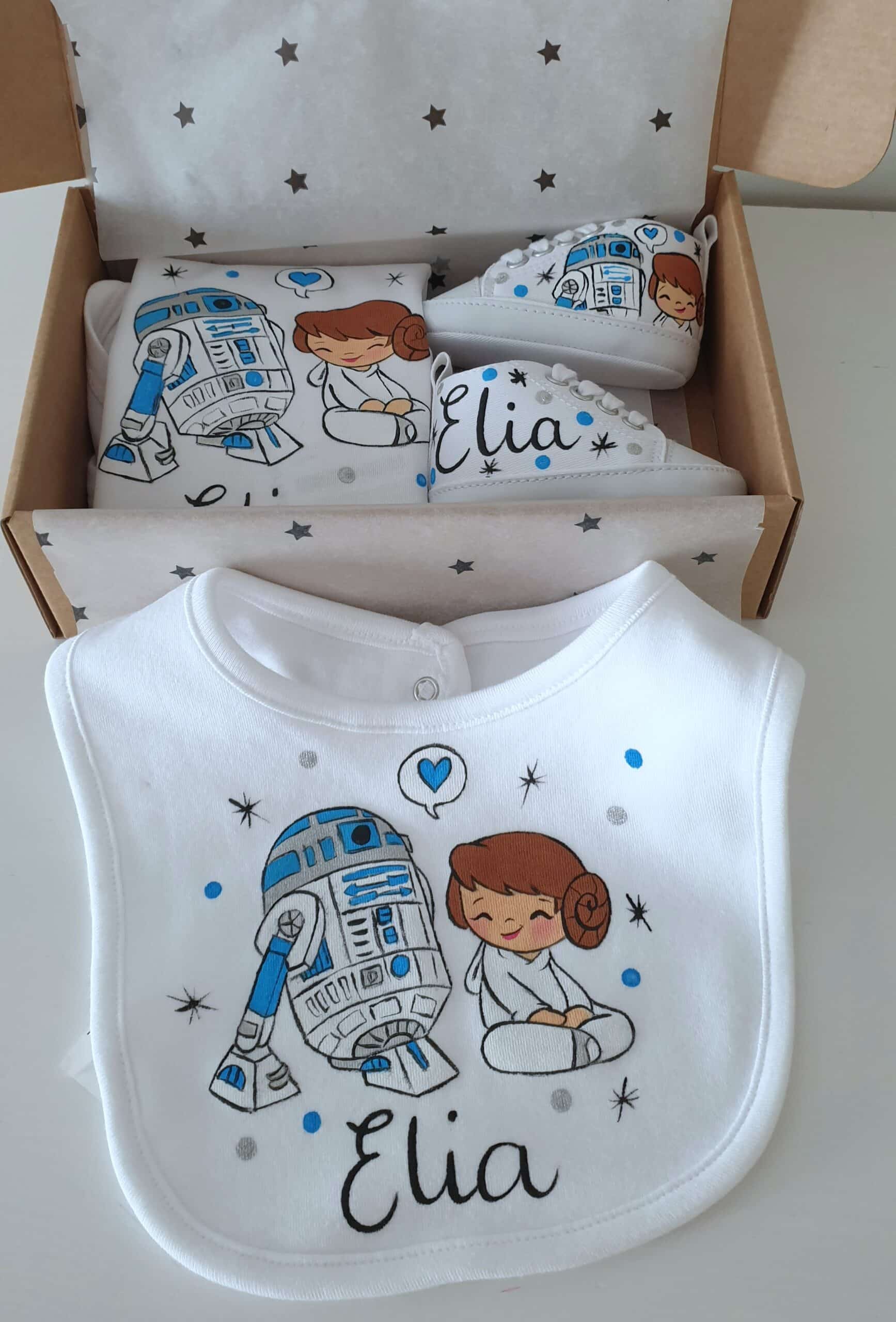 Incluye: un body (de manga larga o manga corta), un babero y zapatillas de bebé.