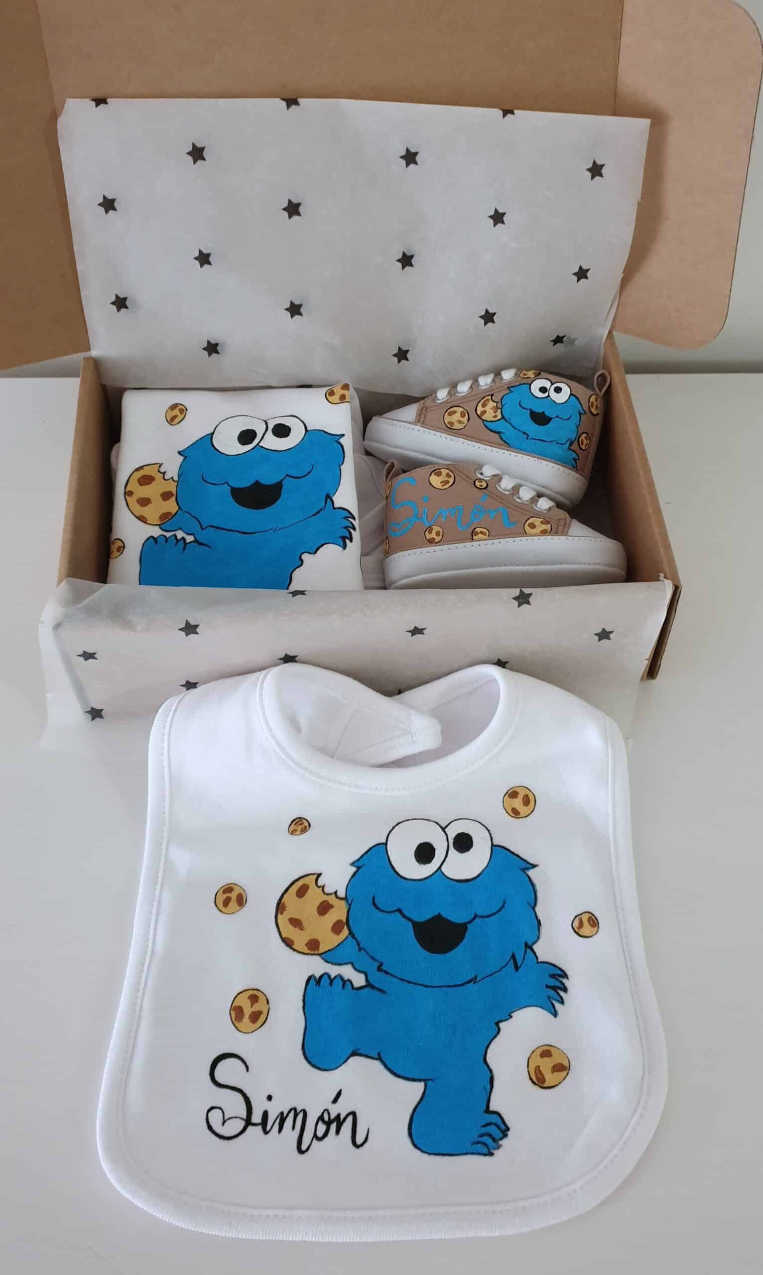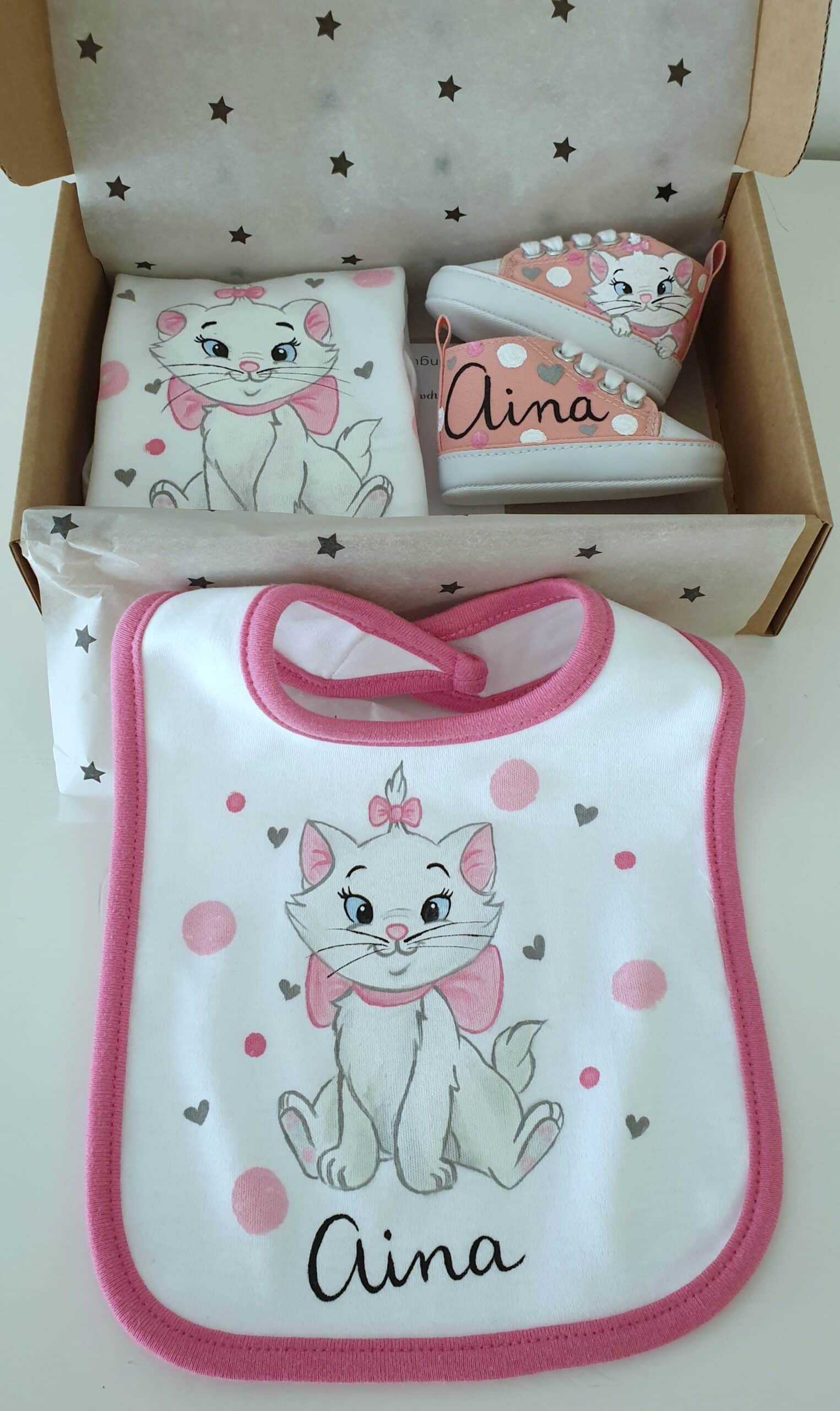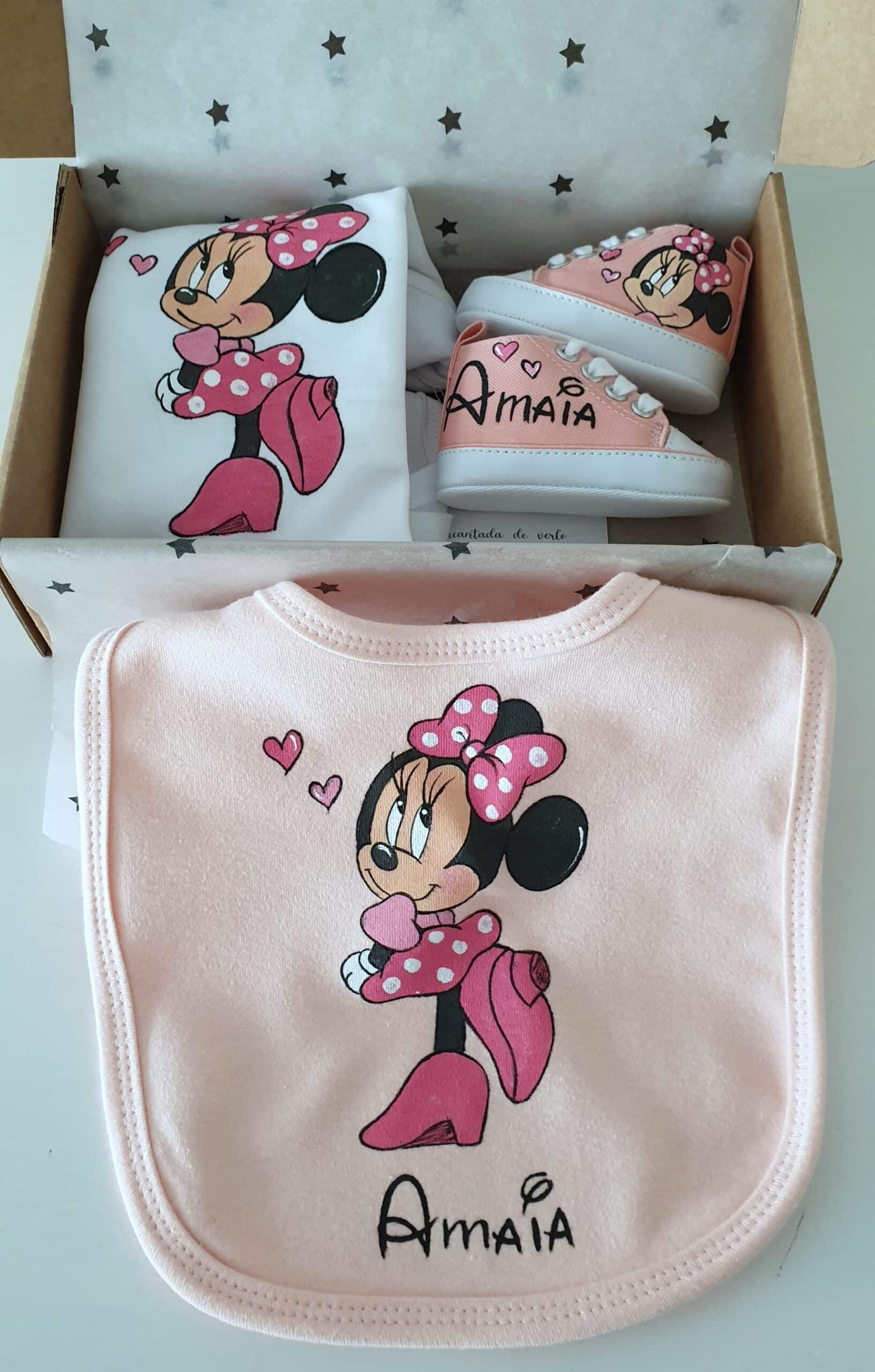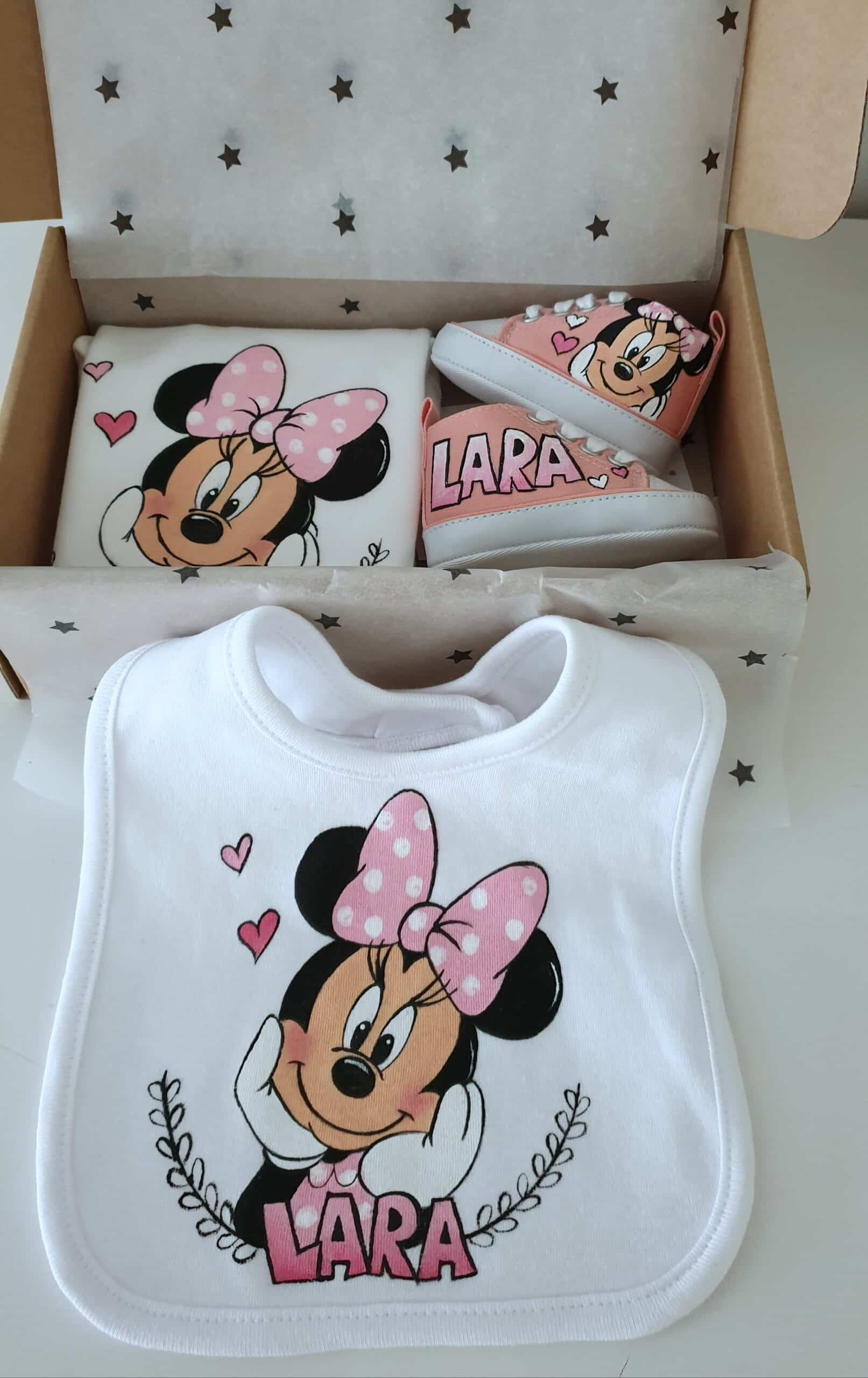 Incluye: un body (de manga larga o manga corta), un babero y zapatillas de bebé.