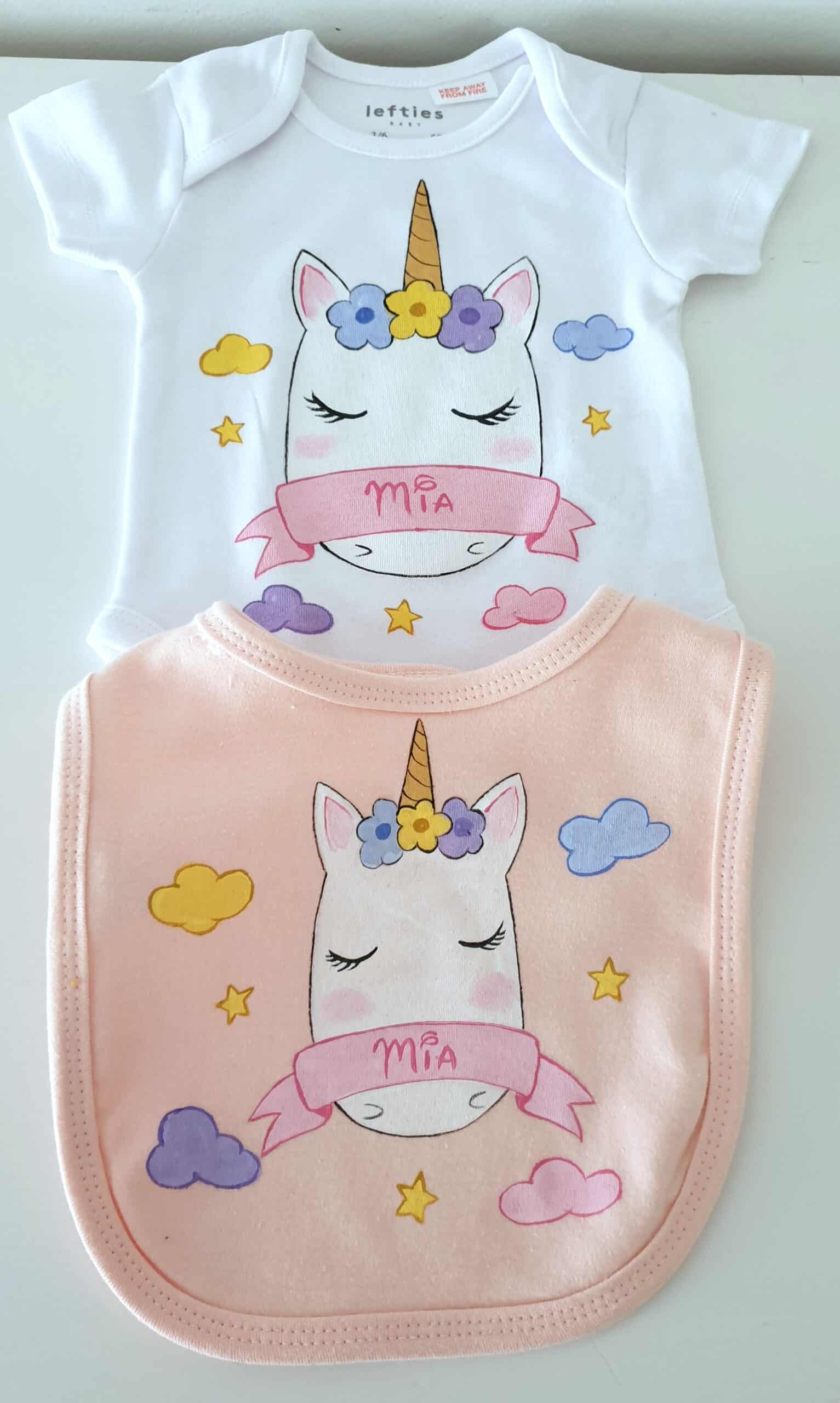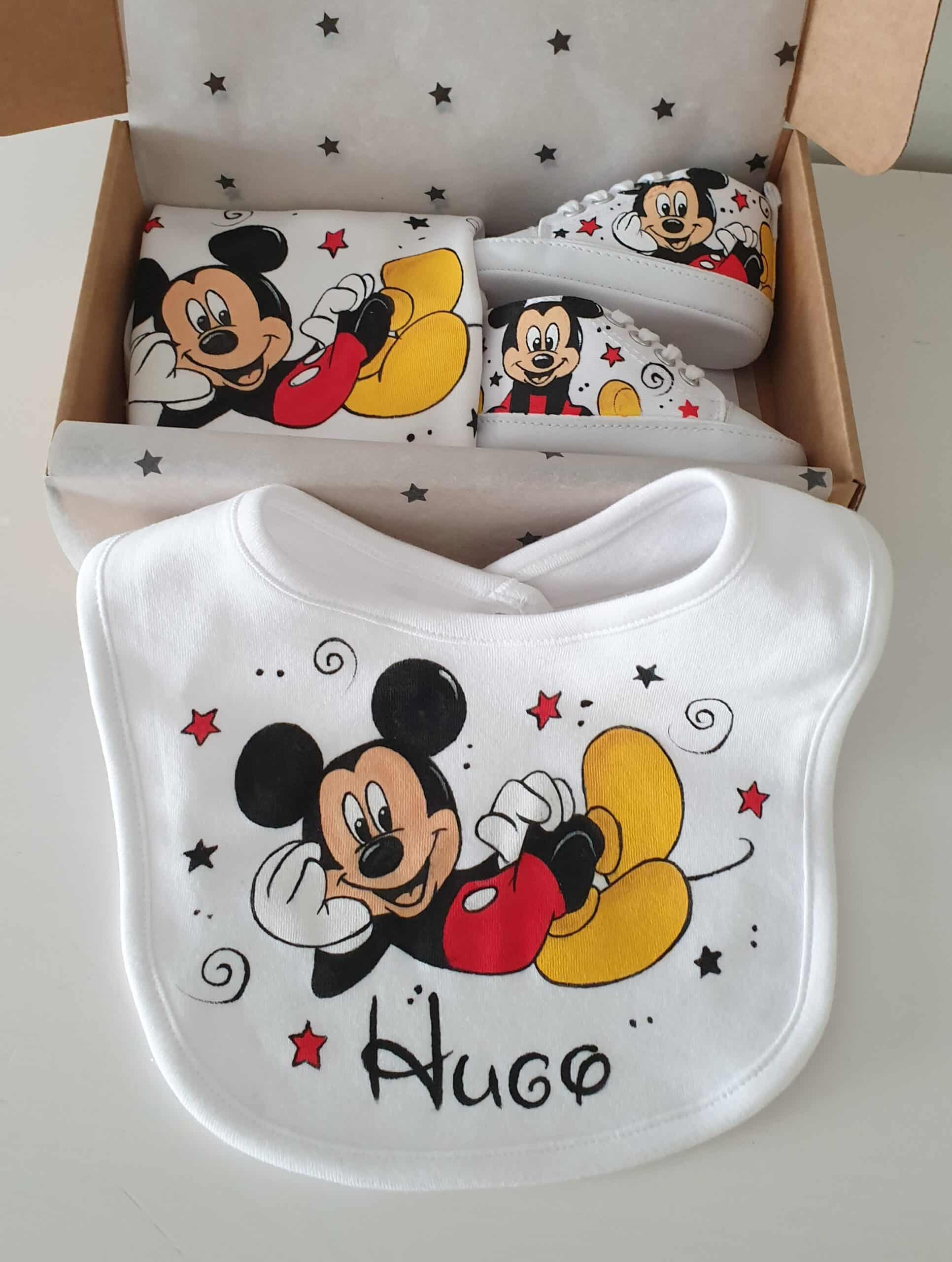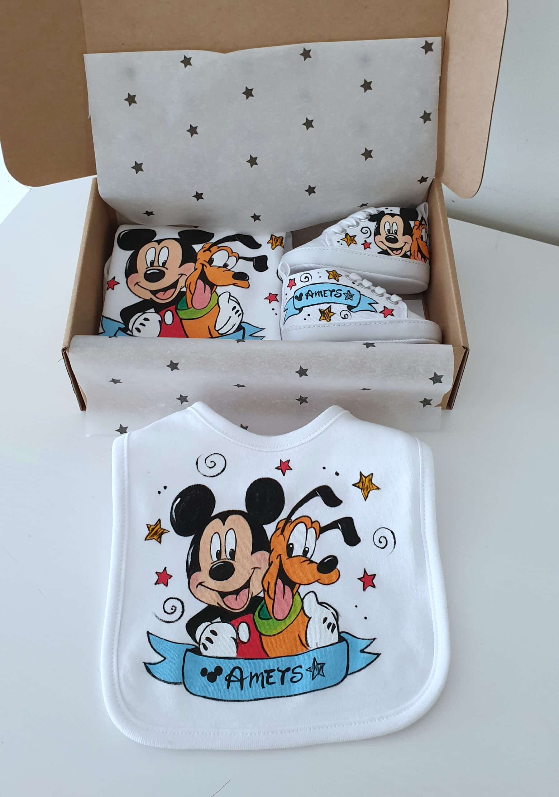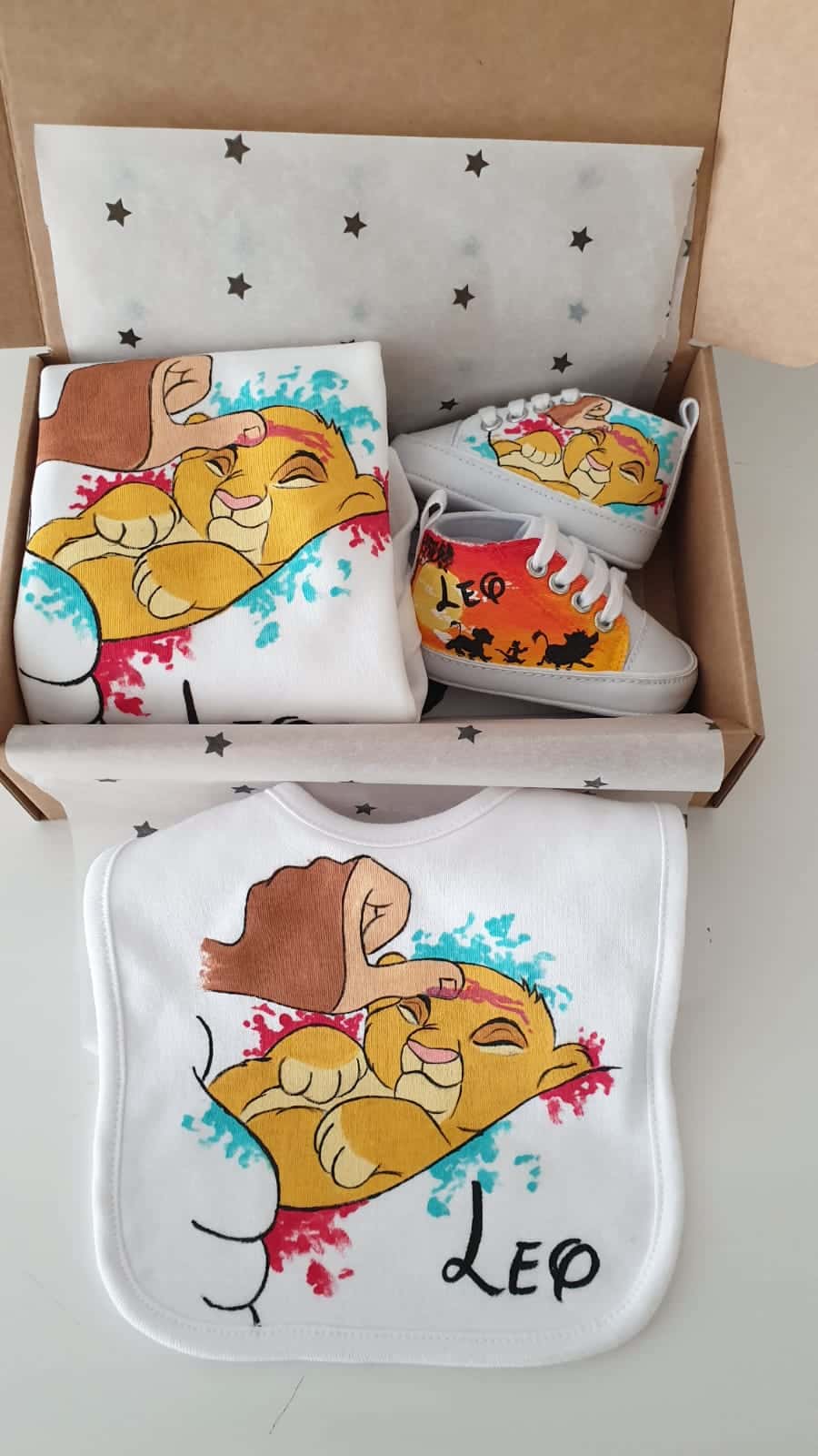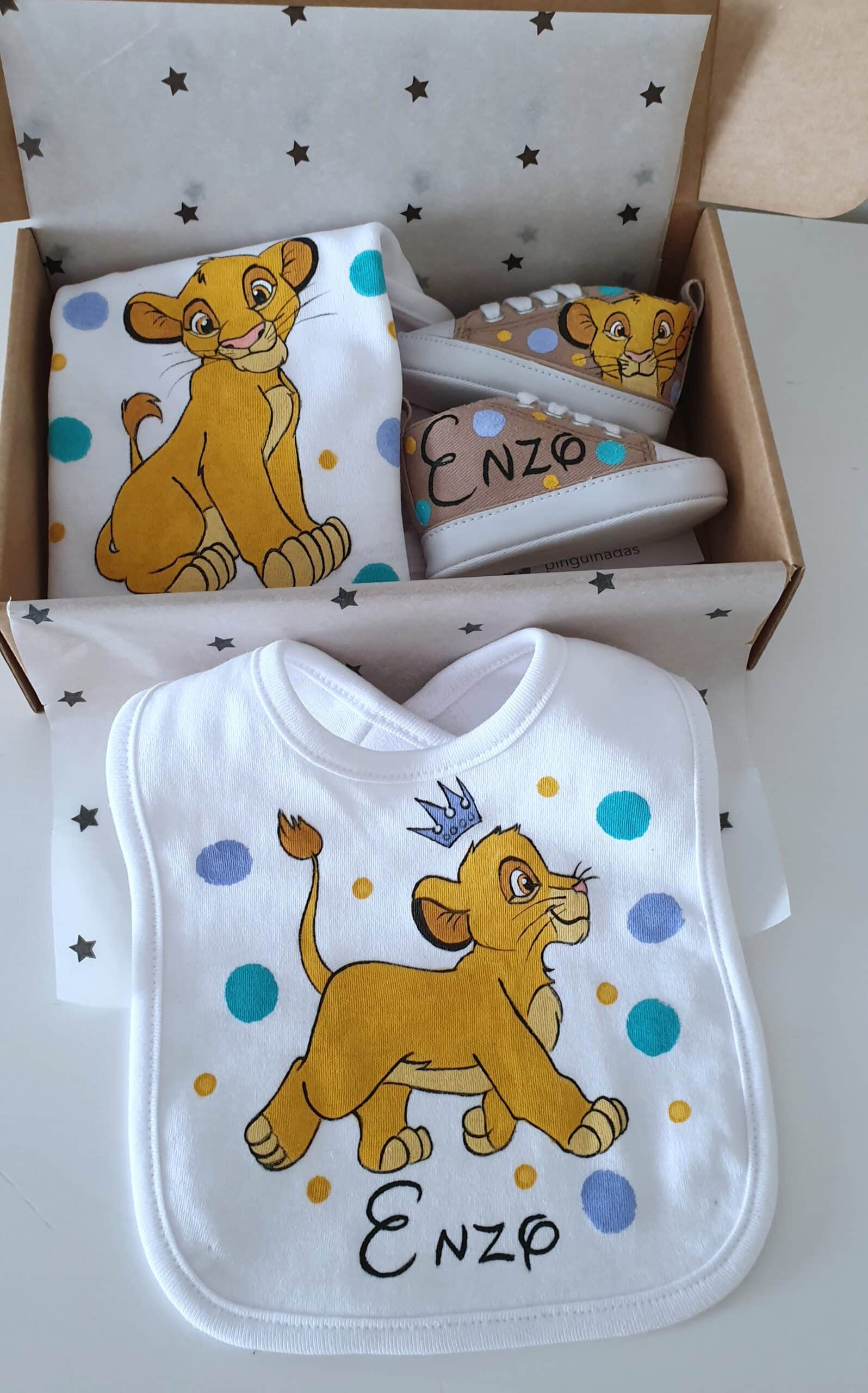 Incluye: un body (de manga larga o manga corta), un babero y zapatillas de bebé.